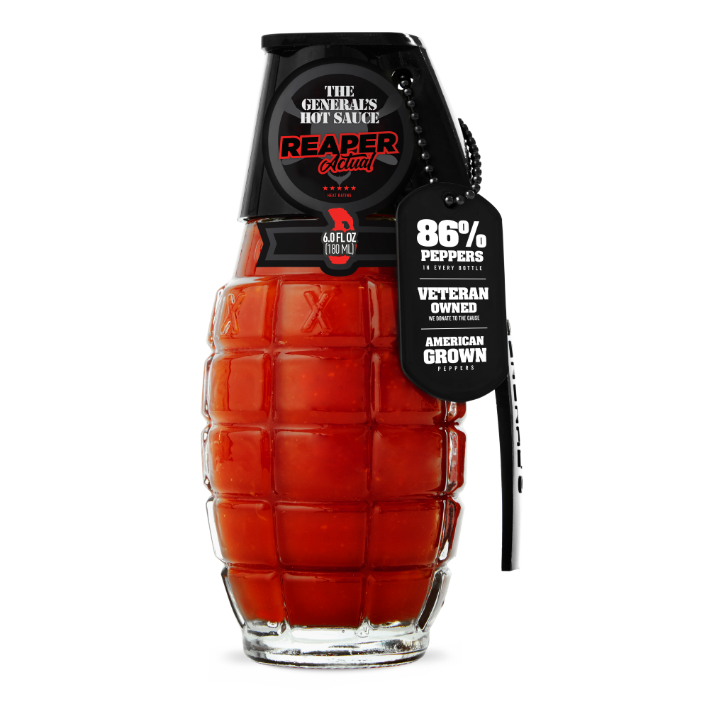 The General’s Reaper Actual Hot Sauce is a scorching hot 5-star blend combining fiery Carolina Reaper peppers, rich red cayennes, and smokey chipotle seasoning.