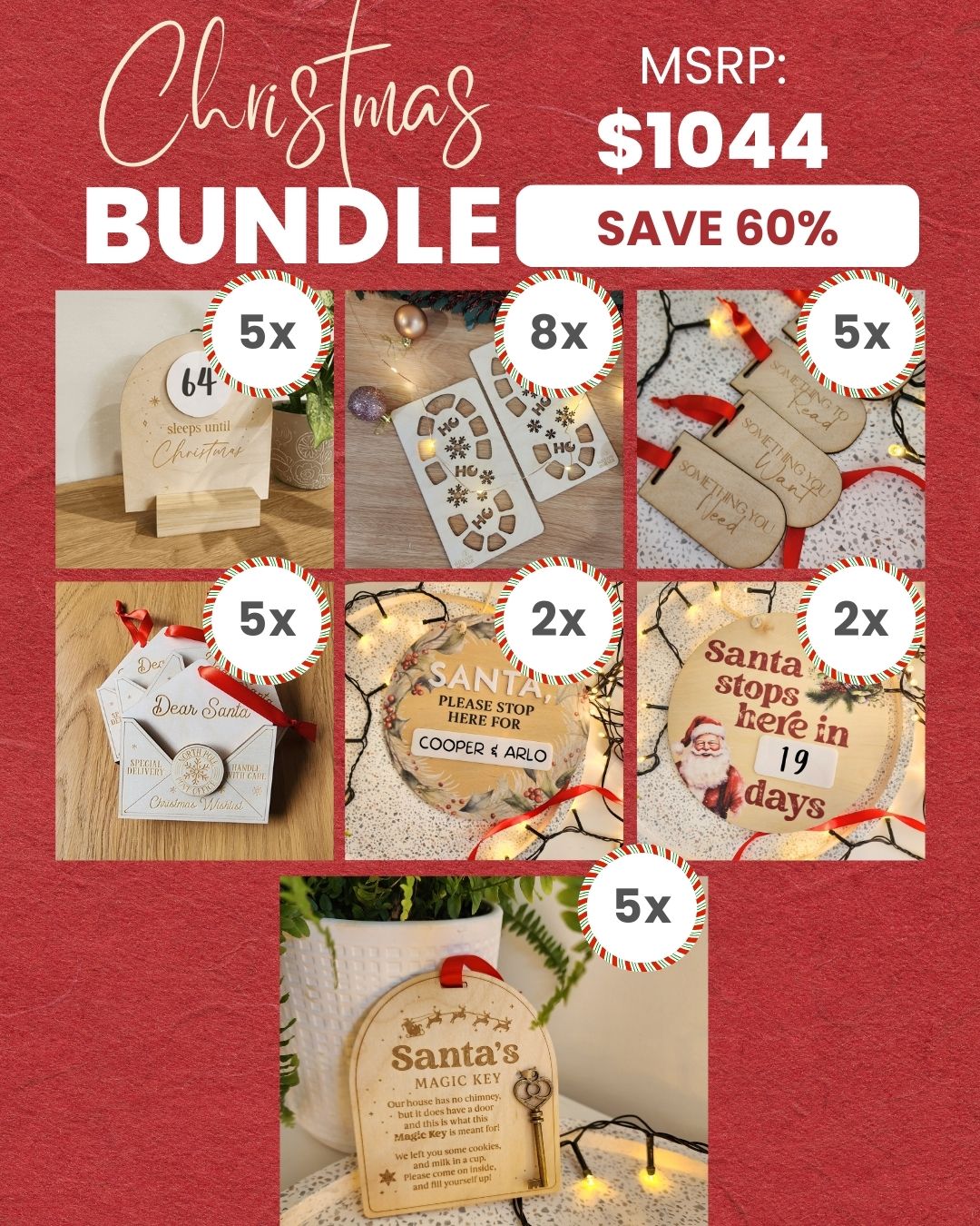 5 x Mini Santa Visits Countdown Plaques 8 x Wooden Santa Footprint Stencils 5 x Wooden Gift Circles 5 x Wishlist Holders 2 x Santa Please Stop Here Discs 2 x Santa Please Stop Here Countdown Disc 5 x Santa's Magic Key Holders